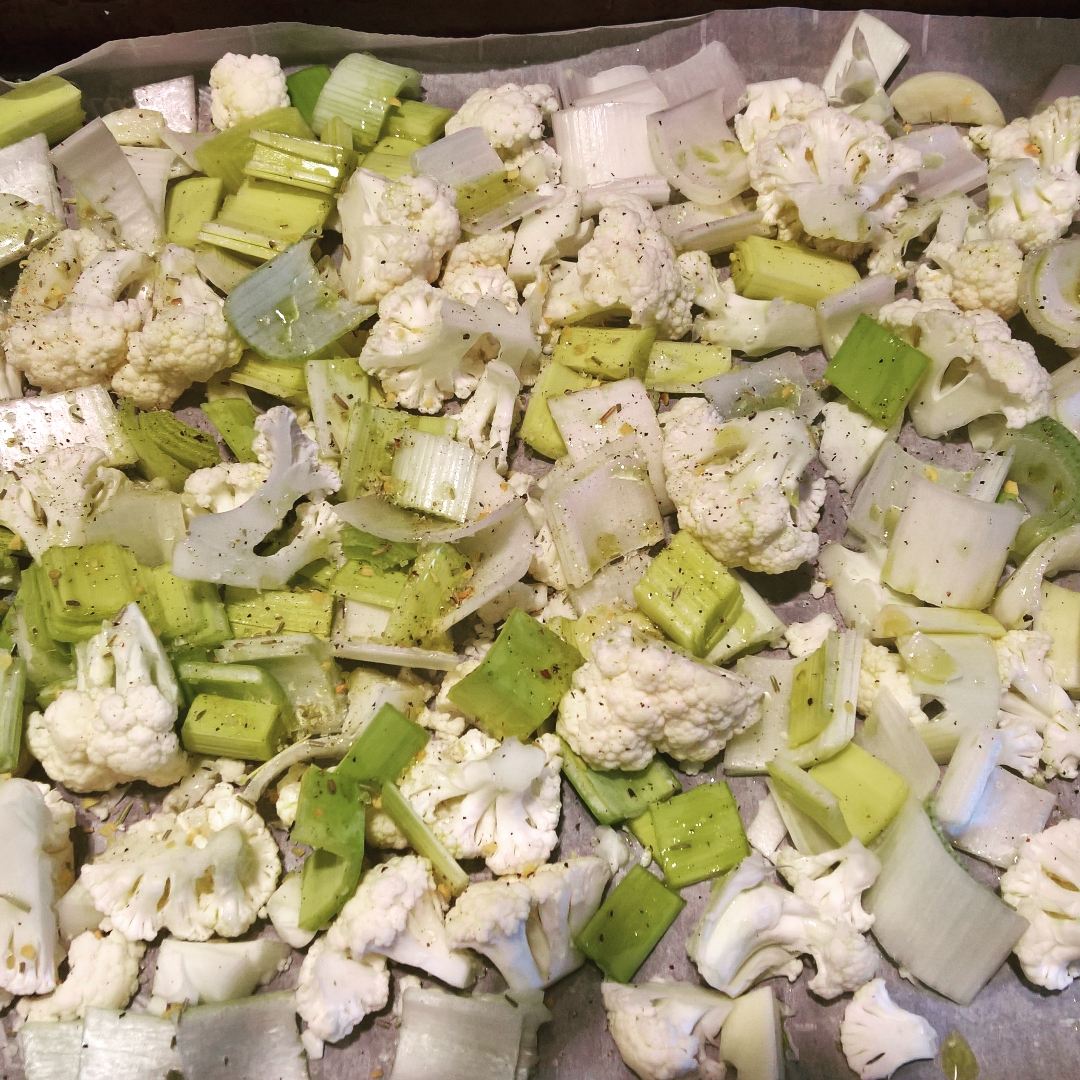 Preheat oven to 425 degrees Fahrenheit and pour olive oil onto a cookie sheet (or some other roasting pan) and rub it around until the bottom is covered, or cover the bottom with parchment paper. Chop the cauliflower and leek up into bite size pieces and put them on the pan to roast with the garlic cloves. Pour olive oil on top of the vegetables, trying to make sure each piece has been touched. I do this by pouring the oil in a crisscross fashion over the pan, and then I roast the vegetables for about 30 minutes, turning them over once or twice during that time. They will be done when there are brown bits on top in places.