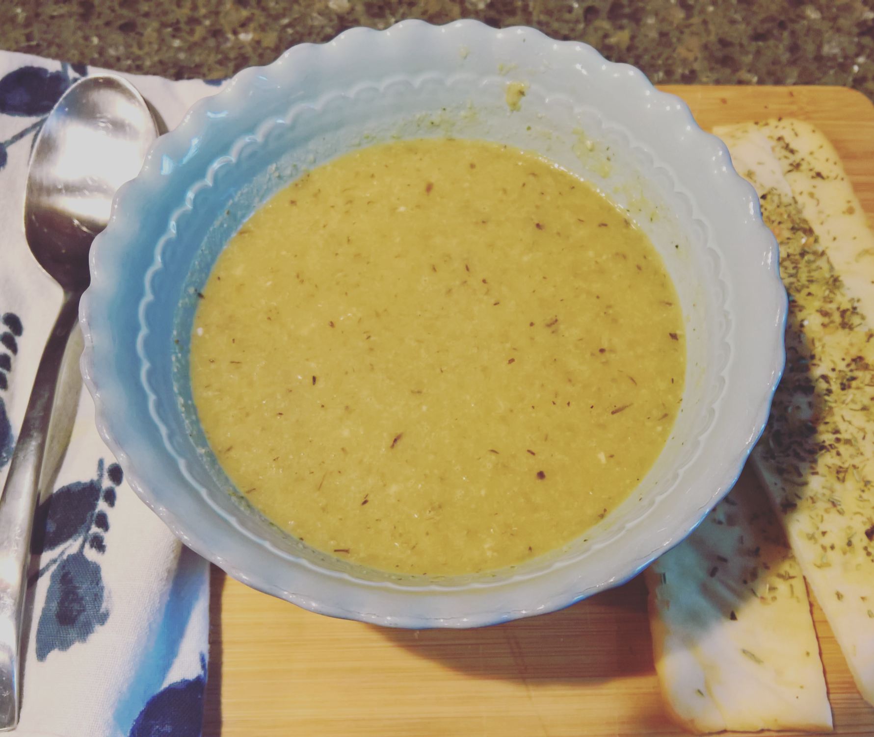 This soup is best with an herb-y bread to dip into it, such as focaccia or rosemary bread. I usually make my own focaccia style bread sticks with Trader Joe’s flat breads by adding olive oil, some seasoning salt, rosemary, basil, and oregano to the top of the flat breads and baking them at 425 for 10 minutes.