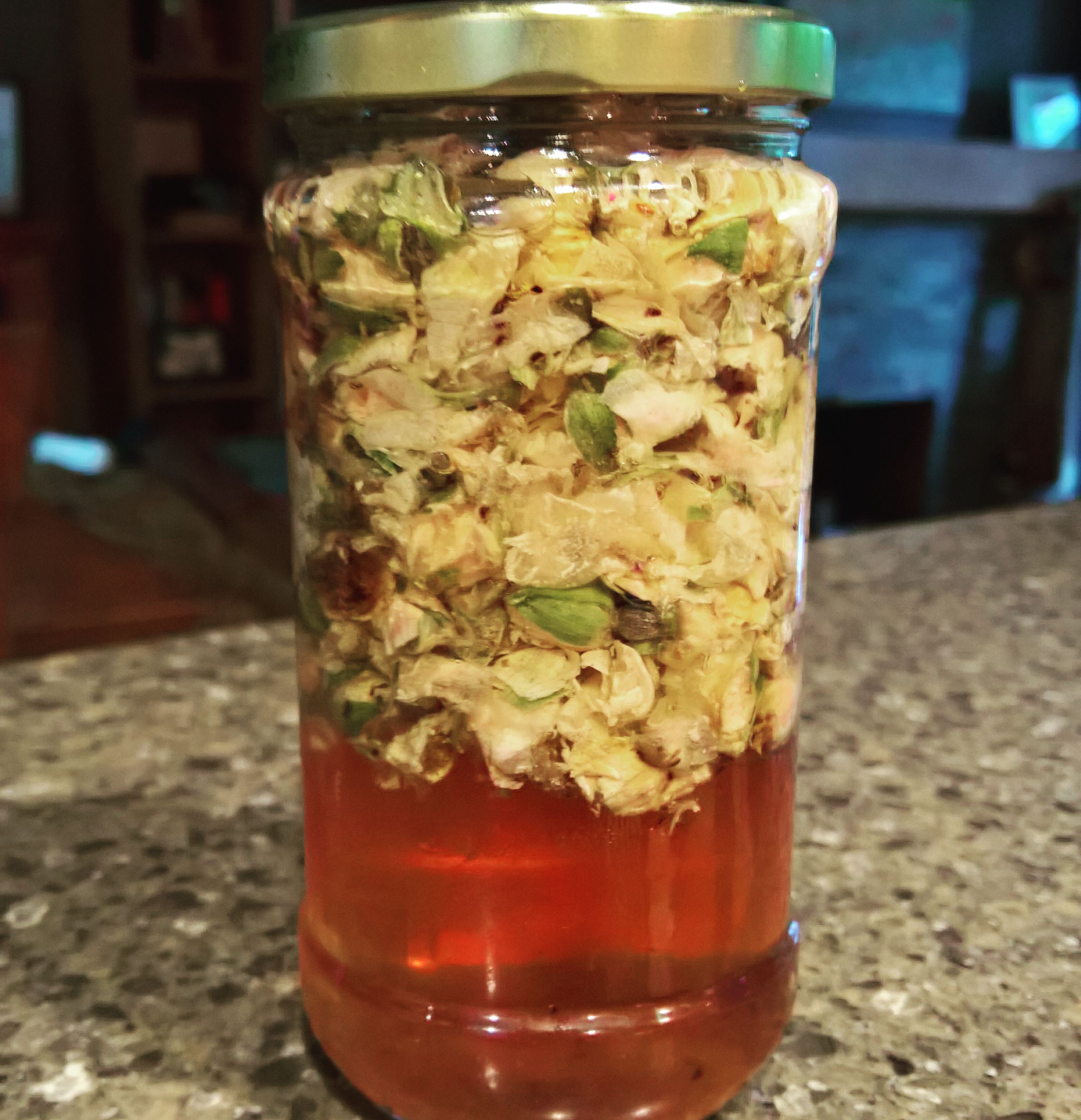 Fill a jar 1/2 to 3/4 full with rose petals or whatever herb you are using. If using buds like I did, bruise and chop them up a bit first.